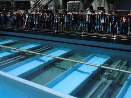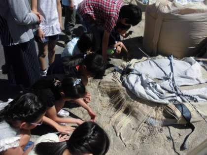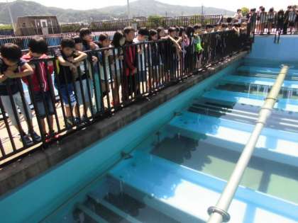次に「ろ過池」を見学しました。砂の間に水を通して,まだ残っているごみなどをろ過して取り除くそうです。ろ過池に使われている砂も見せていただきました。