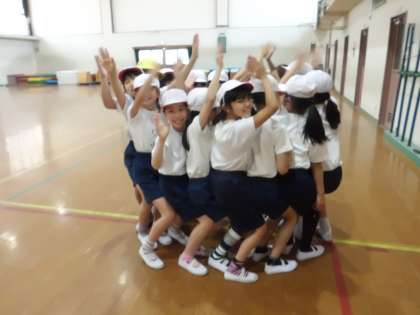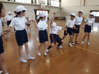 今日は,用具を使って,体をほぐしました。「いっせーので!」というかけ声とともに,となりの人の棒をつかみます。息があってくると,どんどん早く回ることができていました。フープくぐりもしました。体が大きい5年生です。なかなかくぐれずに苦労していました。
