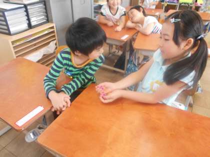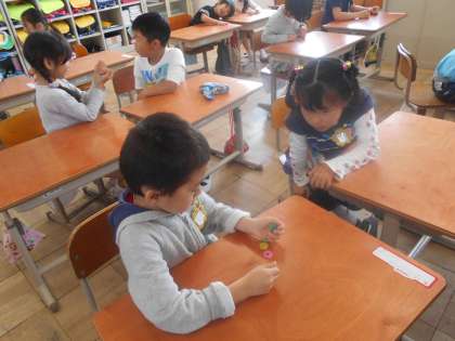 今日は,「8」という数字がいくつといくつに分けられるか考えました。数図ブロックで考えたあとは,おはじきを使ってゲームをしました。正解することができたかな?