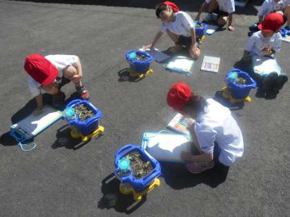 今日はあさがおの芽の観察をしました。じっくり観察して,葉と茎の形や色を観察しました。たくさん芽がでてきていましたね。