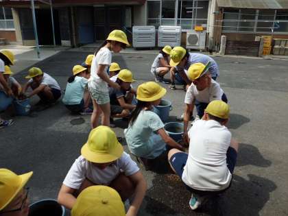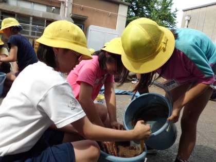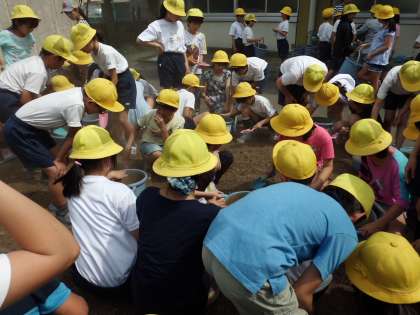 先週の水曜日に「芽出し」をした米作り,今日は「土作り」です。バケツに土と水,そして肥料を入れてよくかき混ぜました。顔や服をどろだらけにしながら,土と格闘していました。