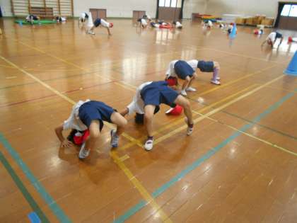 いろいろな動きを見つけて,友だちのまねっこをしながら運動しました。音楽に合わせて,とんだりはねたり,転がったり。跳び箱を使っていろいろな動きを考えたり,マットを使って前転をしたりしました。