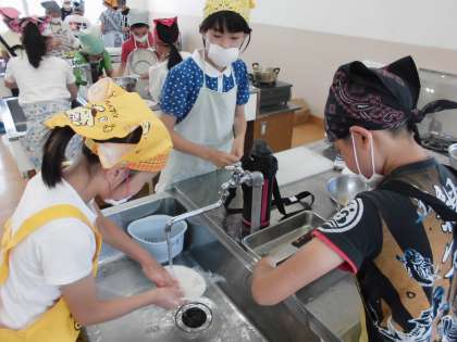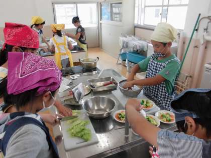 みんなで協力してゆで野菜のサラダを作りました。