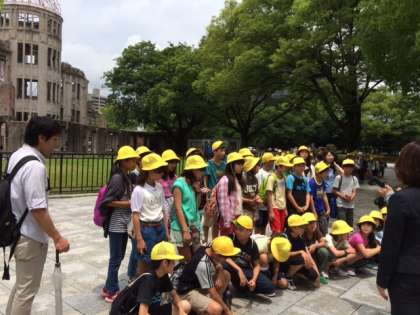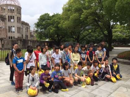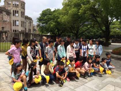 原爆ドームその1 ドーム前で記念撮影。雨も上がりました。