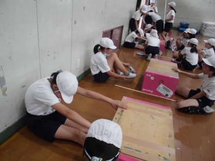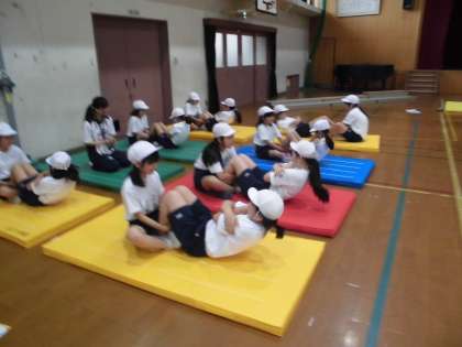 立ち幅跳び,反復横跳び,長座体前屈,握力,ソフトボール投げ,上体起こしなどの項目で自分の体力測定を行いました。