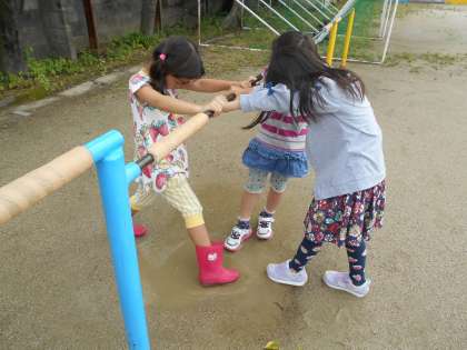 今日は雨上がりの運動場に行き,晴れの日との違いを見つけました。雲が動いていたり,水たまりをみたり,地面をさわったり・・・いろいろなことを発見して,教えてくれました。「木の葉の間から,光が見える!」「きれい!」と嬉しそうにしていました。