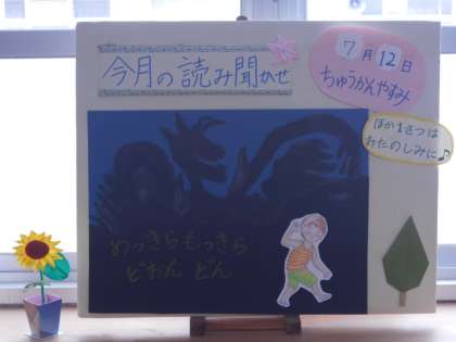 次回の絵本の読み聞かせは,「7月12日(火) 中間休み(10時25分〜10時45分)です。