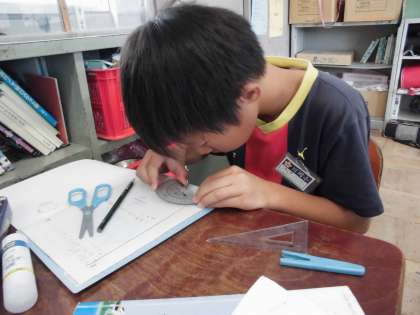 三角形の3つの角を合わせると180度になることを実際に三角形を切って確かめました。