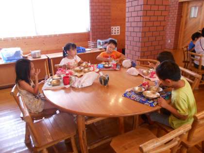今日は栄養教諭の先生に,上手なかみかたを教えてもらいました。奥歯でしっかりかむと,たくさん唾液がでてきます。舌を上手に動かして,少しずつかむと・・・上手にごっくん!とできるのです。給食はランチルームでいただきました。