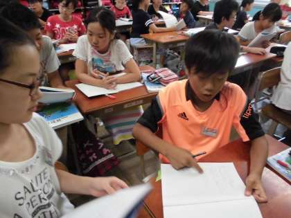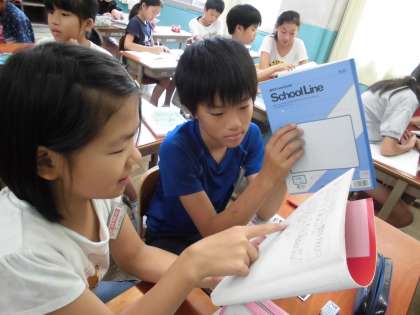 自分の考えを書き込んだノートを使い,指で指示しながら説明しています。