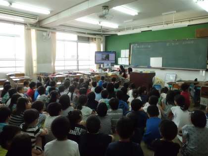 同じ日程でみさきの家に行く池田小・納所小と3校で,テレビ会議システムを使った学校紹介をしました。リーダーの人が川岡小学校について紹介したり,他の学校の紹介を聞いたりしました。紹介のあとの質問タイムでは,お互いの小学校について知りたいことを聞きあいました。川岡小学校の4年生の人数を聞かれて,「92人」と答えると,他の学校からは「多い!」と驚きの声があがっていました。みさきの家で会うのが楽しみになりましたね。