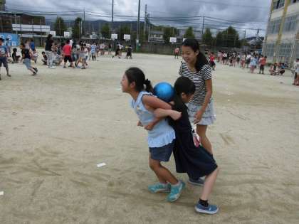 運動委員会が主催のクラス対抗ボール運びゲームが中間休みに運動場を使ってありました。二人一組で背中でボールを挟んで運びます。