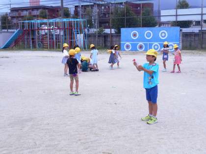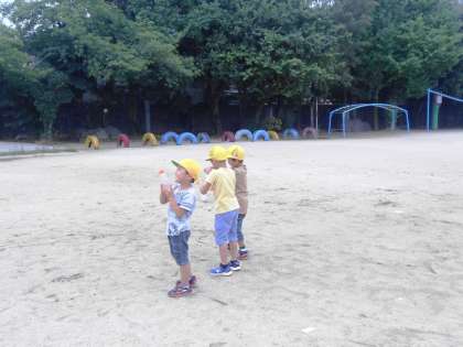 しゃぼん玉遊びのあとは,水でっぽう遊びをしました。いろいろな容器に水を入れて,遠くにとばしたり,地面に絵をかいたりしました。