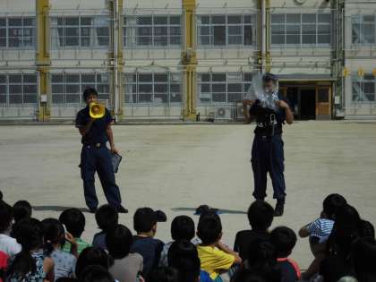 今日は消防署の方を招いて,火災の避難訓練を行いました。