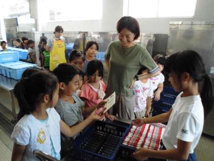 付けの様子を 給食キャラクターのパックンの色(赤・緑・金)