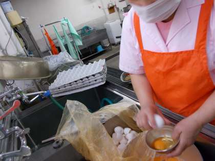 給食室では,給食調理員が卵を割るための専用エプロンで汚染を