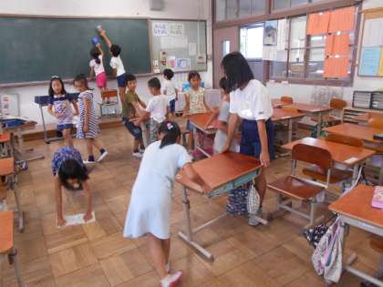 入学して約半年。6年生のお兄さん,お姉さんと一緒に,がんばってそうじしています。上手にほうきやぞうきんを使うことができるようになってきましたね。