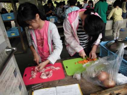 なかなか火が薪に点かなかったり,材料を入れる順番を間違ったりする子どもたちを前に先生たちも声をかけたい気持ちをグッとこらえ,時間をかけてあたたかく見守りました。失敗したり時間がかかったりしても自分たちだけで作りご飯はきっと格別だったことでしょう。どの班も最後はおいしくいただきました。