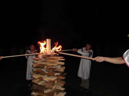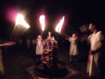 静まり返った暗闇の中から不思議な鈴の音とともに山の神と火の子たちが登場し,「団結」「挑戦」「感謝」の3つの火を点火して始まりました。