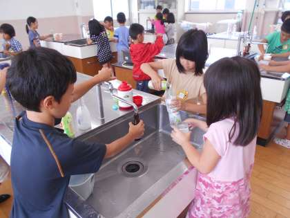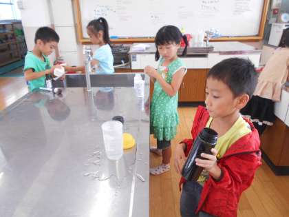 今日はいろいろな容器に水を入れて,コップにうつしたり,容器から容器にうつしたりしながら,かさくらべをしました。お友だちと協力しながら,楽しく活動することができました。