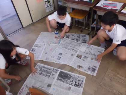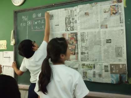 今日は,新聞を使って1平方メートルの正方形を作りました。そして,教室にあるものの大きさを調べました。子ども達のの感想は,1平方メートルは,意外と広い!でした。