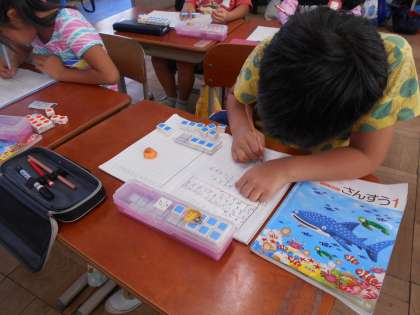 ノートにしっかり自分の考えをかいています。10のかたまりからひいて・・・さあ,それからどうしましょう?がんばって考えてね。