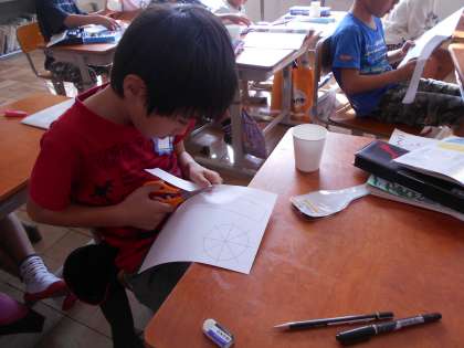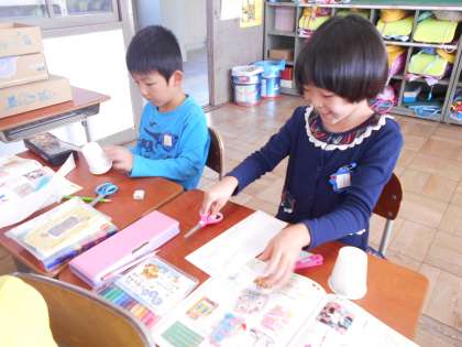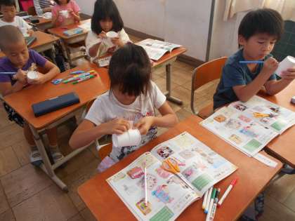 今日は,風があたるとくるくる動くおもちゃを作りました。紙コップのふちにきりこみをいれて,ななめに追って,もようや絵をかきました。