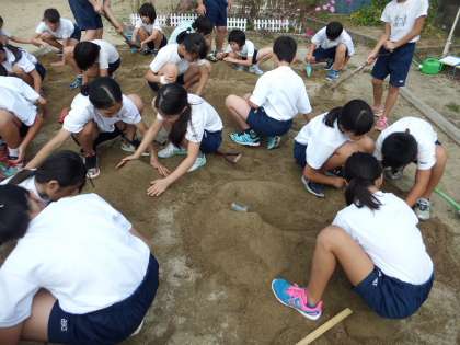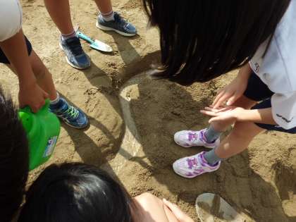 流れる水のはたらきを確かめるために,砂場に「川」をつくりました。流れが速いところ,ゆるやかなところ,曲がっているところを設定して,実験しました。予想と比べながら,しっかり観察していました。
