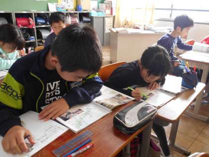 「中小工場では,どんなものを生産しているのだろう。」という疑問をもった5年生。今日は,北陸地方の中小工業について考えました。めがねの生産量におどろきました。細かい資料を読み取っています。