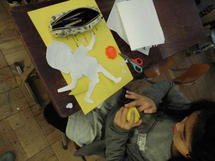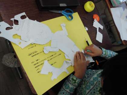 紙版画に取り組んでいます。自分が縄跳びをしているところを紙版画にします。体の動きが伝わるように,体の関節のところで曲げる工夫をしました。