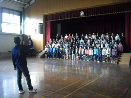 今日の練習は体育館です。指揮に合わせて、きれいな歌声を響かせています。