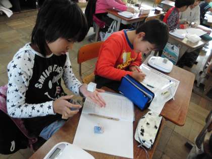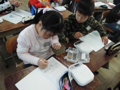 1人に1台,電子ばかりを使って鉄,アルミニウム,プラスチック,木の同じ体積の重さを比べました。