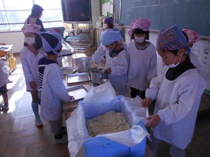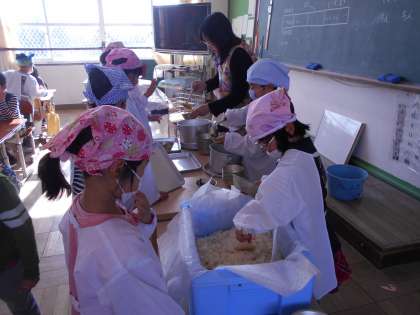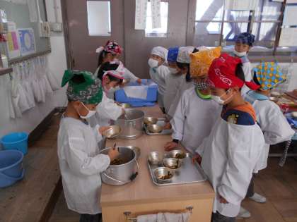 今日は「肉じゃがカレーあじ」でした。肉じゃがはみんなが大すきな献立です。当番活動もしっかりできました。