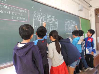 それぞれの班の結果を書き出し,実験の記録の平均を出しました。結果を見て,考察し,電磁石の力を強くするためには,「流す電流を大きくすること」と「コイルの巻き数を増やすこと」がわかりました。