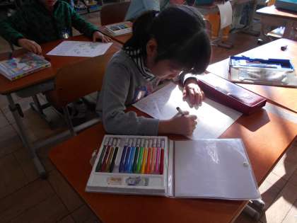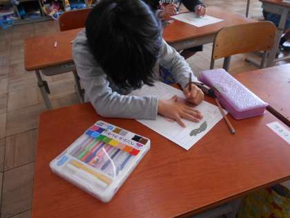 どんぐりや松ぼっくりなどを使って作った作品について,ふりかえりカードをかきました。どんな作品ができあがったかな?