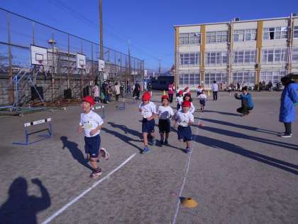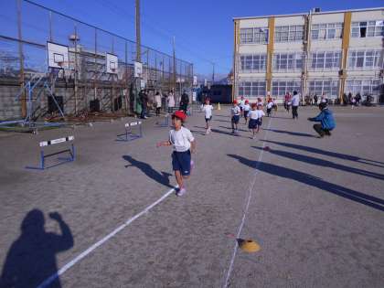 「○○さんがんばれ!」「力いっぱいがんばれ!」と,応援する声が聞こえてきます。ゴールは校長先生に向かって走りました。