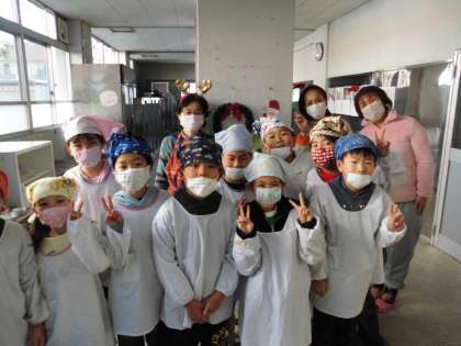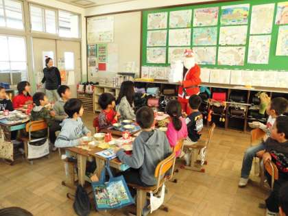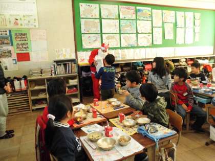 給食室へ給食をとりに行くと・・・・給食調理員さんや栄養教諭の中野先生がにこにこ顔で迎えてくださいました。頭にはトナカイの角や可愛い帽子の飾りもついていて,とっても楽しくなります。教室で美味しくいただいていると・・・・何と!!!!!サンタさんがプレゼントを持って来てくださいました。日直さんが代表でプレゼントを受け取りました。こんな素敵な「お楽しみ♪」をしてくださって,ありがとうございます!!!!!