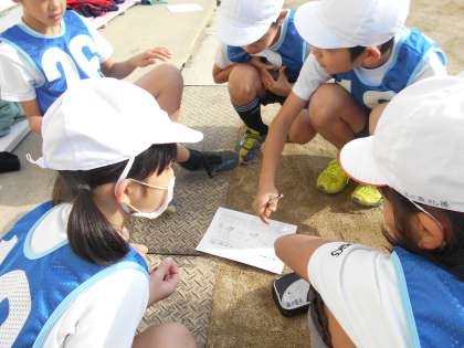 寒い中そとで元気よく体育をしています。どんなところに気をつけるかめあてを確認しました。試合間には作戦タイムも設けています。「守備のあまいところに打とう!」「強く打つと思わせておいて,弱く打とう!」「守備の位置を変えよう」などチームによっていろいろな作戦が出てきました。