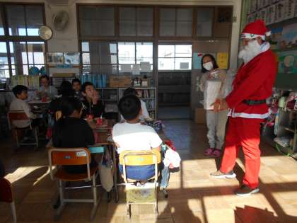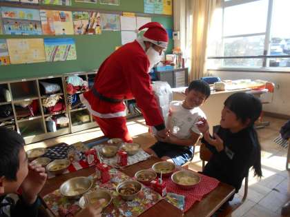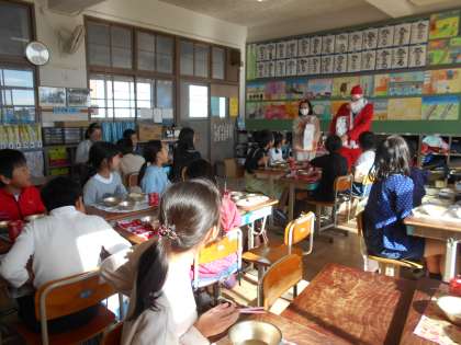 給食をおいしくいただいていると,突然「メリークリスマース!!」という声が聞こえました。みんな,おどろいて言葉が出ませんでした。一足早い,クリスマスプレゼントでしたね。