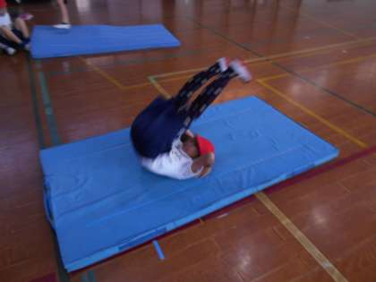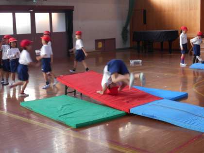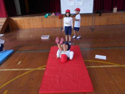 「あと一回でマット遊びの学習は終わりですよ。」と言うと,みんな「ええ!もっとしたいな。」「早かったな。」と言っていました。とても楽しい学習だったのですね。学習の成果の華麗な技の数々を,ご覧ください。