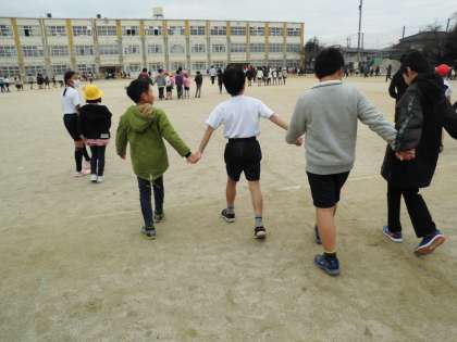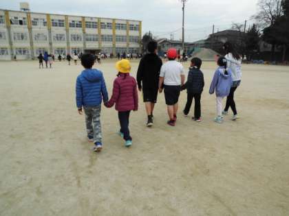 楽しく遊んだ後は,手をつないでそれぞれの教室に戻ります。高学年のお兄さん,お姉さん,いつも優しく遊んでくれてありがとう。後ろ姿も頼もしいですね。