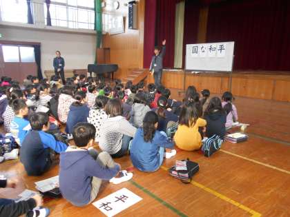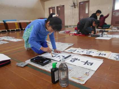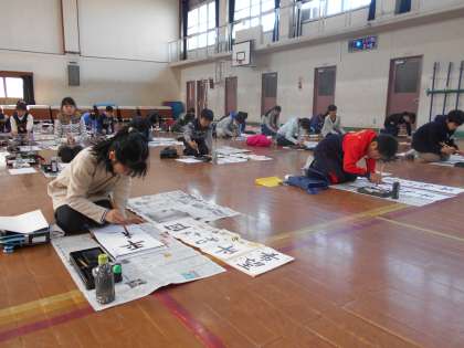 年があけ10日ほど経ちましたが,「新春!書き初め大会」を体育館で行いました。しんと静まり返った体育館で,「平和な国」と書きました。気をつけるポイントもたくさんありましたね。