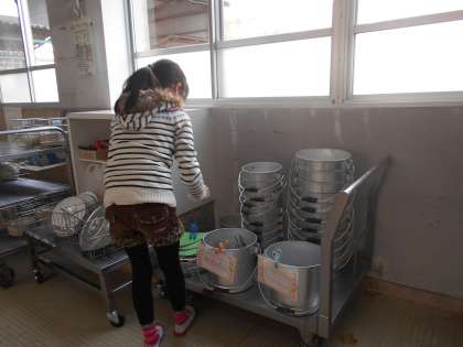 食器が新しいものに変わってから,給食ホールでの食器を片付ける位置が変わりました。どうすればスムーズに片付けられるのか,給食調理員さんがたくさん考えてくださっていました。給食委員の人たちも,知恵を貸してくださいね!