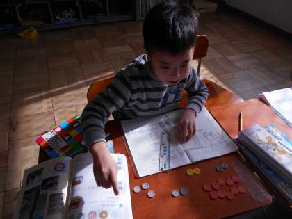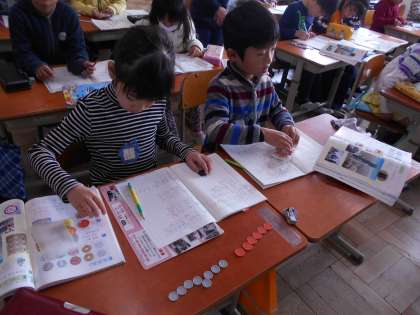 今日はお金を使って計算をしました。10円玉や一円玉の数を数えて,たしざんをしたり引き算をしたりしました。
