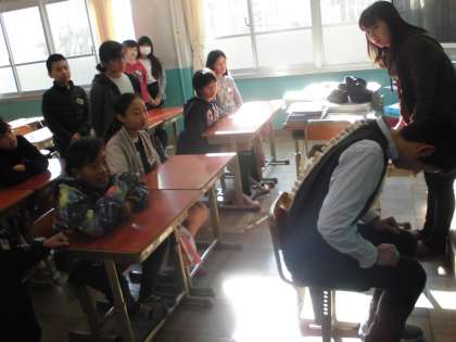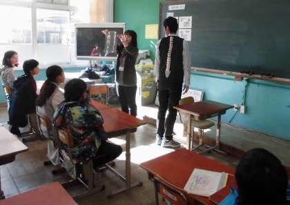 身体計測前に姿勢指導を行いました。悪い姿勢の時,身体の中はどんな状態なのか。担任の先生に一肌脱いでいただき,みんなで確かめました!