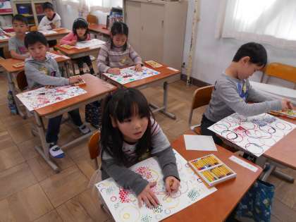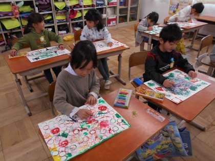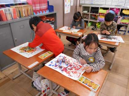 絵の具で色をつけた画用紙に動物や魚の絵をかき,切り抜きました。そして,それを別の画用紙にはりつけました。とてもカラフルな作品ができあがりました。