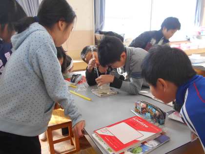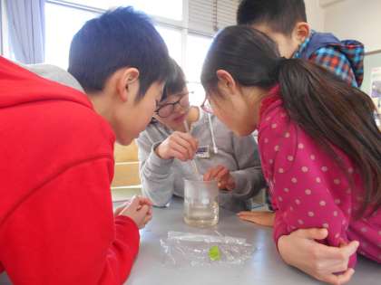 今日は,前回溶け残った食塩を溶かしきるにはどうすればよいのかを考えました。水溶液をあたためてみるチームと,水の量を増やしてみるチームに分かれて実験です。結果はどうなるのかな。