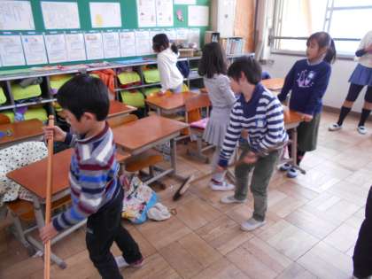 みんなで協力して教室や廊下をぴかぴかにしています。今は6年生のお兄さん,お姉さんに手伝ってもらって掃除をしていますが,2年生になったら自分たちだけで掃除をします。たくさん教えてもらってくださいね。