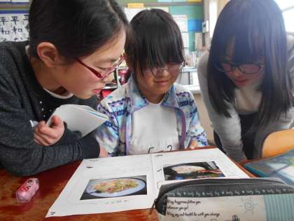 友だちの作ったアレンジメニューを見て,だれのメニューをすいせんするかじっくり悩んでいるところです。