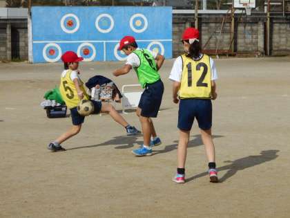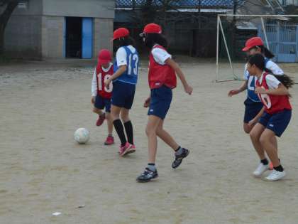 体育でサッカーに取り組んでいます。チームで作戦をたてながら楽しく活動しています。
